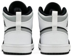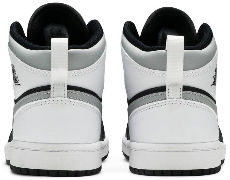 The Air Jordan 1 Mid PS ?¡ãWhite Shadow?¡À is the preschool sizing of Michael Jordan’s coveted first signature shoe in an easy-to-style colorway. The ?¡ãWhite Shadow?¡À appears on the Jordan 1 Mid silhoutte . one of the most popular looks in Jordan Brand’s line. Design details include buttery black leather on the toe cap . forefoot . and mid-panel. Contrasting white leather can be found on the perforated toe box . middle eyelet panel . collar . and heel. Branding appears in the form of a grey leather Swoosh on either side . a black ?¡ãWings’?¡À emblem on the collar . and white Jumpman on the tongue tag sewn onto the white nylon tongue. The white pull tab on the heel is a helpful design that makes wearing and taking off the shoe a breeze.