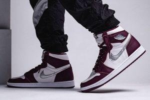 The Air Jordan 1 Retro High OG ‘Bordeaux’ dresses the archetypal silhouette in a white leather upper with vinous leather overlays at the forefoot . heel and collar. Similar to the CO.JP ‘Midnight Navy’ colorway . the sneaker is accented with a metallic silver Swoosh and a jeweled Wings logo on the lateral ankle. A woven Nike Air tongue tag atop the lightly padded nylon tongue delivers an OG touch. A traditional two-tone AJ1 cupsole packs encapsulated Nike Air cushioning under the heel.