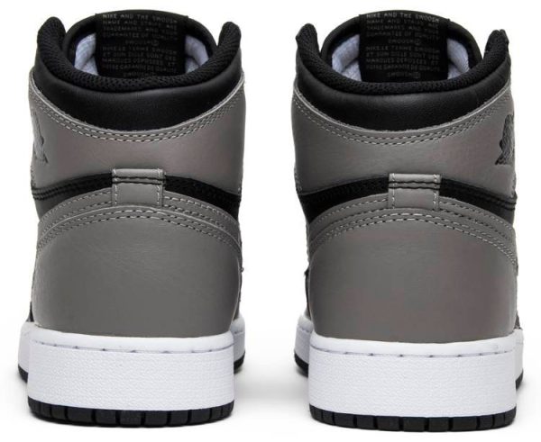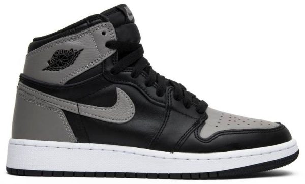 This grade school sized Nike Air Jordan 1 Retro High OG GS ‘Shadow’ 2018 is a retro re-release of the OG Fall 1985 colorway. The shoe features a black and medium grey leather upper with a white midsole and black outsole. It also features OG Nike Air branding on the tongue and the Wings logo on the ankle collar.