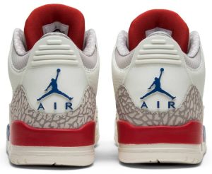Inspired by Michael Jordan’s uniform for a 1988 charity game in which he scored 54 points . the Air Jordan 3 Retro ‘International Flight’ sports a patriotic color scheme on an Off-White leather build. Sport Royal accents grace the eyelets . midsole . and embossed Jumpman heel branding . while contrasting pops of Fire Red stand out on the rear midsole segment and the Jumpman logo on the tongue . with the right one distinguished by Michael Jordan’s signature. The signature Jordan elephant print is rendered in light grey on the leather overlays at the toe and heel.