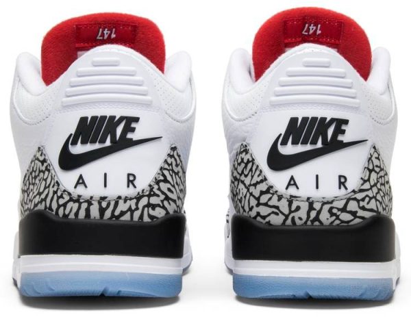 In celebration of Michael Jordan’s iconic launch from the free throw line thirty years ago during the 1988 Slam Dunk Contest . Jordan Brand released the Air Jordan 3 Retro NRG ‘Free Throw Line.’ The sneaker comes dressed in white with Cement Grey accents on the toe box and heel and Fire Red detailing on the eyelets and on the tongue. The model also boasts a translucent sole with a red stripe . exactly where MJ took off from the line. Other details include “3:51” lettering on the back pull tab to remember the time Jordan took flight . and “147” on the tongue as a nod to his final score.