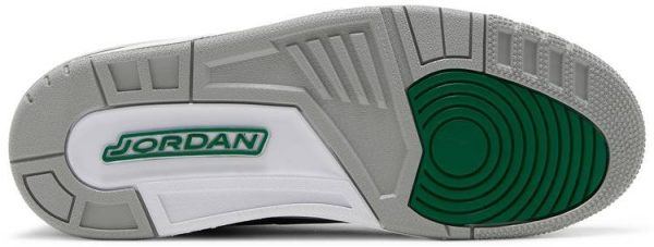 This Air Jordan 3 features a Black nubuck upper with Pine Green accents on the midsole . ankle . branding . and eyelets. Signature elephant print wraps the toe and heel atop a White midsole and Grey rubber outsole completes the design.