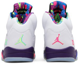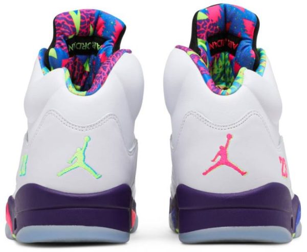 The Air Jordan 5 Retro ‘Alternate Bel-Air’ follows in the footsteps of the original ‘Bel-Air’ Air Jordan 5 from 2013 . featuring a ’90s-inspired color scheme paying homage to Will Smiths’ NBC sitcom . ‘The Fresh Prince of Bel-Air.’ The classic mid-top sports a white leather upper mounted atop a contrasting purple midsole with visible Air cushioning. Mismatched vibrant accents are applied to the interior lining . Jumpman branding hits and embroidered ’23’ on the lateral heel.