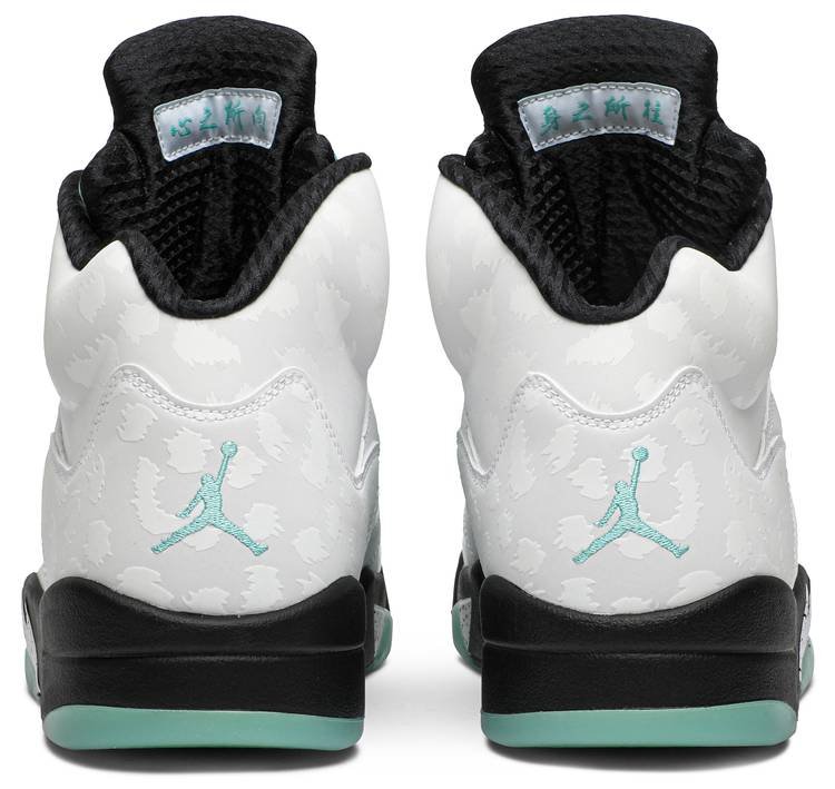 This take on the Air Jordan 5 gives Michael Jordan’s fifth signature sneaker an updated look and an ‘Island Green’ color scheme. Released in November 2019 . the shoe boasts a white leather upper decorated with tonal leopard print and Island Green accents on the tongue . eyelets . quarter panel netting and translucent outsole. Classic elements from the original model . first seen in 1990 and inspired by a WWII fighter plane . include shark-tooth shapes on the midsole and a visible Air unit.