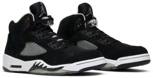 The Air Jordan 5 Retro ‘Oreo’ features a black nubuck upper and white midsole with speckled oreo shark teeth. Released in November of 2013 to celebrate the silhouette’s 23rd anniversary . the design also includes an anthracite tongue . a ’23’ embroidered on the lateral side of the upper near the heel . and an ice blue translucent outsole.