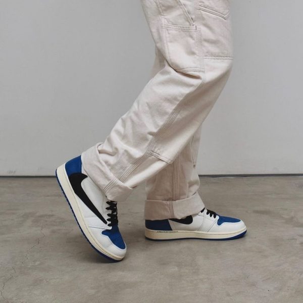 The Fragment Design x Travis Scott x Air Jordan 1 Retro High brings together two of Jordan Brand’s most influential creative partners. The resulting design finds the foundational sneaker dressed in white tumbled leather with Scott’s signature inverted Swoosh in contrasting black leather. Similar to the rapper’s AJ1 collaboration from 2019 . a hidden pouch is built into the black nylon collar. Contrasting royal blue hits settle on the on the toe box . collar flap and heel overlay. The latter is stamped with Fragment’s lightning bolt logo on the right shoe and La Flame’s Cactus Jack smiley face on the left. Additional branding elements include a standard Nike Air woven tongue tag . a secondary Cactus Jack tongue tag and a classic Jordan Wings logo imprinted on the lateral ankle. A rubber cupsole with pre-yellowed sidewalls lend the shoe a vintage aesthetic.