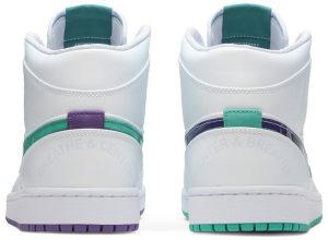 Launching as part of a three-piece Pregame Pack highlighting how athletes prepare for competition . the Luka Doncic x Air Jordan 1 Mid SE ‘Mindfulness’ draws inspiration from the NBA star’s tranquil headspace in the locker room. The mid-top’s pristine leather build is accented with mismatched green and violet coloring on the signature Swoosh and rubber outsole. ‘Breathe and Center’ is inscribed on the heel of the left shoe . ‘Center and Breathe’ on the right.