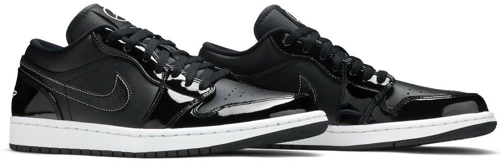 The Air Jordan 1 Low ‘All Star 2021’ celebrates the NBA’s midseason showcase with a sleek colorway of the classic silhouette. The black leather upper is enlivened with shiny tonal patent leather overlays at the toe and heel. A matching patent leather Swoosh is accented with white contrast stitching . while an embroidered Wings logo adorns the back heel. The sneaker rides on a standard rubber cupsole . featuring a foam wedge and encapsulated Nike Air for enhanced cushioning.