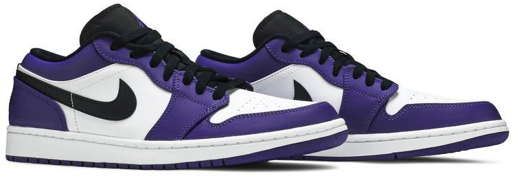Jordan Brand gave the low-top treatment to one of its most popular Jordan 1 Highs to create the Air Jordan 1 Low Court Purple. The Air Jordan 1 Low Court Purple comes with color-blocking similar to the Jordan 1 High Court Purple White. The Court Purple features distinct purple overlays and a white leather base that gives it a timeless appearance. Extra details that enhance its look include a black nylon tongue . black laces . and a black leather Swoosh on the medial panels. The condensed Air-Sole element offers lightweight cushioning while its grooved outsole improves surface traction.