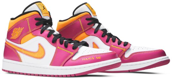 The Jordan Brand created the Air Jordan 1 Mid Dia de los Muertos to honor the famous Mexican holiday . the Day of the Dead. The design utilizes color and graphic patterns to pay homage to Mexican customs. The Air Jordan 1 Mid Dia de los Muertos references the traditional flowers that grow all over Mexico. The shoe features a three-color palette of yellow . fuchsia . and white. On both sides of the shoe . there is the classic Nike Swoosh logo. The logo . however . is accentuated by textured stitching that gives these sneakers a unique look. On the toe . text reading ?¡ãPara Mi?¡À . or ?¡ãFor Me?¡À in English . is printed in yellow. A white midsole and fuchsia outsole completes the design.