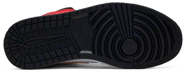 The Air Jordan 1 Mid ‘Multi-Color’ showcases a design that borrows from Nike’s ‘What The’ concept . bringing together clashing hues to accent a classic Chicago-inspired foundation. The latter is readily seen on the toe and collar . both rendered in black and red. A white leather quarter panel . overlaid with an orange leather Swoosh . is flanked by contrasting pops of Turbo Green and purple.