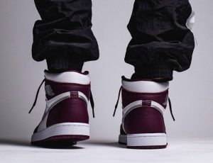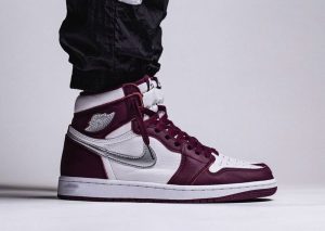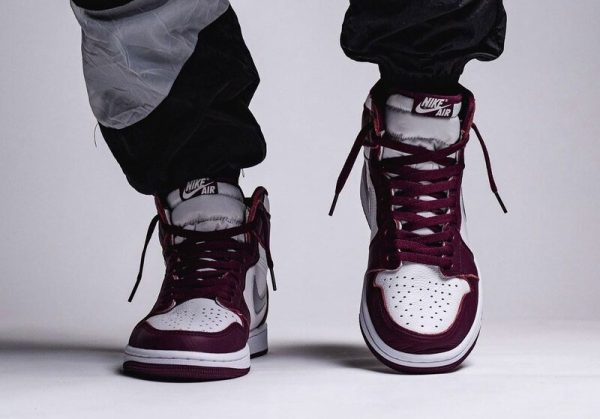 The Air Jordan 1 Retro High OG ‘Bordeaux’ dresses the archetypal silhouette in a white leather upper with vinous leather overlays at the forefoot . heel and collar. Similar to the CO.JP ‘Midnight Navy’ colorway . the sneaker is accented with a metallic silver Swoosh and a jeweled Wings logo on the lateral ankle. A woven Nike Air tongue tag atop the lightly padded nylon tongue delivers an OG touch. A traditional two-tone AJ1 cupsole packs encapsulated Nike Air cushioning under the heel.