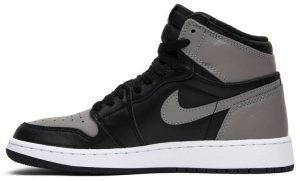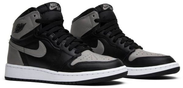 This grade school sized Nike Air Jordan 1 Retro High OG GS ‘Shadow’ 2018 is a retro re-release of the OG Fall 1985 colorway. The shoe features a black and medium grey leather upper with a white midsole and black outsole. It also features OG Nike Air branding on the tongue and the Wings logo on the ankle collar.