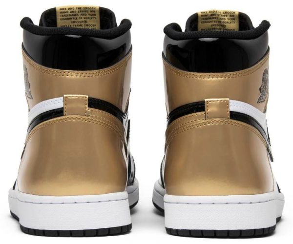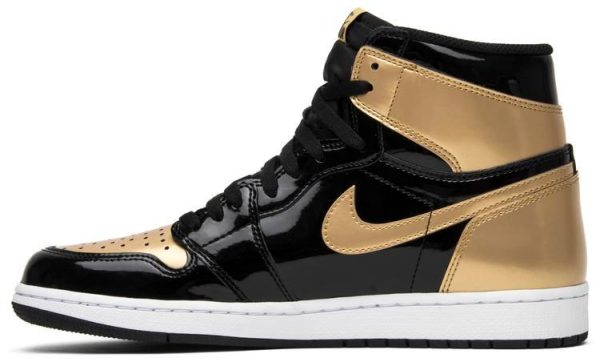 The Air Jordan 1 Retro High OG NRG ‘Gold Toe’ features a black patent leather upper with distinctive metallic gold accents on the perforated toe box . tongue branding . and the heel panel. The high top also boasts a white side panel which extends from the midfoot to the heel . and a white rubber midsole. Other details include suede accents on the lacing structure . large Swoosh branding . and a tonal black outsole.