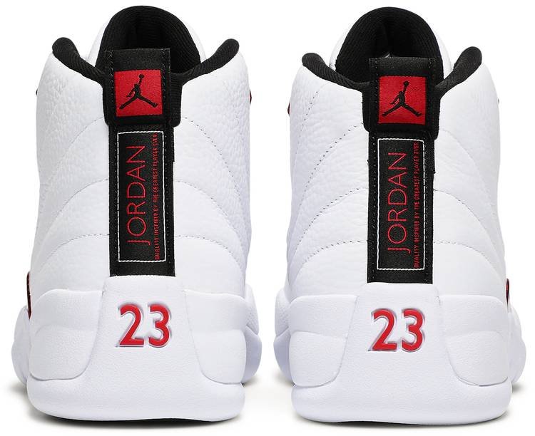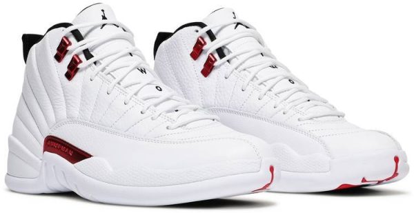 The Air Jordan 12 Retro ‘Twist’ projects a subtle take on the classic Chicago Bulls color palette. A pristine white finish on the stitched tumbled leather upper is matched by the signature lizard-textured mudguard. Sharp crimson accents land on the sneaker’s molded eyelets and a small midfoot overlay stamped with a Jordan wordmark. Contrasting black Jumpman branding decorates the tongue and webbing heel tab. The mid-top rides on a lightweight Phylon midsole with encapsulated full-length Zoom Air.