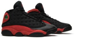 The Air Jordan 13 received a retro update in 2017 outfitted in its original color scheme. The Air Jordan 13 Retro ‘Bred’ 2017 features a black leather upper with matching 3M reflective ballistic mesh overlays on the sidewall. The sneaker also boasts a padded tongue for added comfort . True Red suede overlays . and the iconic green hologram on the ankle.