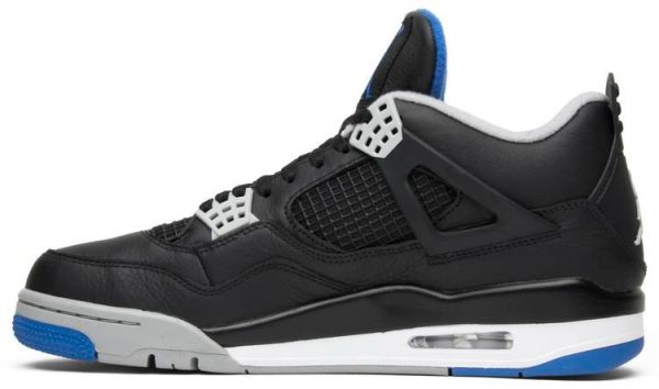 The Air Jordan 4 Retro ‘Motorsports Alternate’ released in 2017 alongside the mostly white ‘Motorsport’ colorway . inspired by MJ’s motorcycle racing team and modeled after a hyper-limited colorway gifted to the team’s 16 members back in 2006. This pair features a black leather upper with contrasting Matte Silver detailing on the molded eyelets . collar lining and Jumpman heel logo. A second Jumpman icon graces the woven tongue tag in Game Royal. A polyurethane midsole with visible Air cushioning anchors the classic mid-top silhouette.