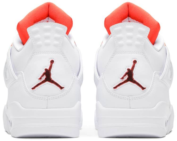 The Air Jordan 4 Retro ‘Orange Metallic’ dons an all-white leather build . with its white monochromatic finish punctuated by sharp bursts of Team Orange on the eyelets . interior tongue and Jumpman branding hits . located on the woven tongue tag and heel. The visible Max Air unit embedded in the heel of the midsole is similarly tinted orange. The kicks dropped alongside three additional colorways in Court Purple . University Red and Pine Green.