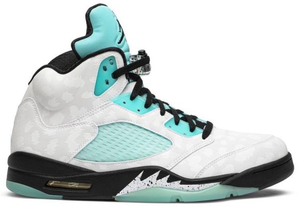 This take on the Air Jordan 5 gives Michael Jordan’s fifth signature sneaker an updated look and an ‘Island Green’ color scheme. Released in November 2019 . the shoe boasts a white leather upper decorated with tonal leopard print and Island Green accents on the tongue . eyelets . quarter panel netting and translucent outsole. Classic elements from the original model . first seen in 1990 and inspired by a WWII fighter plane . include shark-tooth shapes on the midsole and a visible Air unit.