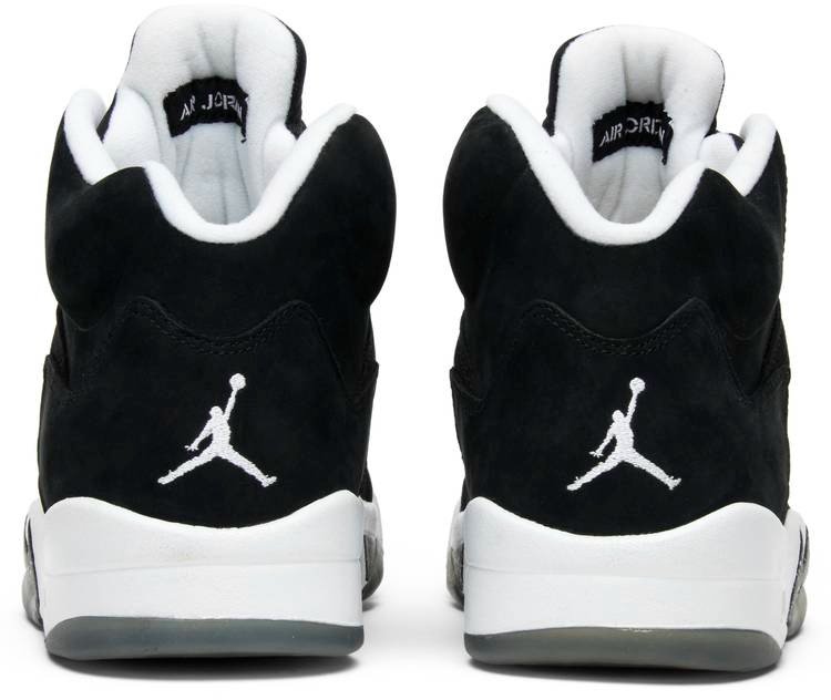 The Air Jordan 5 Retro ‘Oreo’ features a black nubuck upper and white midsole with speckled oreo shark teeth. Released in November of 2013 to celebrate the silhouette’s 23rd anniversary . the design also includes an anthracite tongue . a ’23’ embroidered on the lateral side of the upper near the heel . and an ice blue translucent outsole.