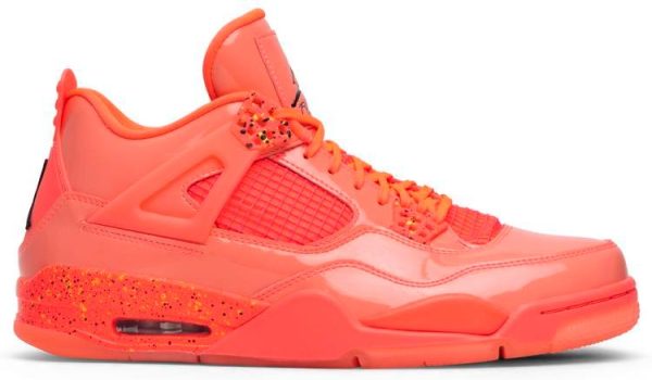 Sporting an energetic . monochromatic finish . the women’s Air Jordan 4 Retro NRG ‘Hot Punch’ is dipped entirely in Hot Punch. The mid-top’s leather upper is topped with patent leather paneling . while black and Volt speckling accents the midsole and eyelets. The herringbone outsole features partially translucent rubber.